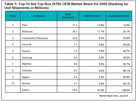 與此同時,2009年市場份額數(shù)據(jù)顯示,隨著Pace公司完成對飛利浦STB業(yè)務(wù)的收購,正在成為新的市場份額王者。
