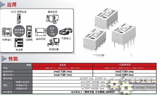 同樣,在精密電子元器件領域具有世界級技術實力的歐姆龍,利用其獨特的傳感與控制技術持續實現了繼電器、開關、轉接器等電子產品的小型化、高性能和節能特性,也必將為西部高端電子元器件應用帶來更多新選擇。歐姆龍電子部件的展品包括:FPC連接器、IDC連接器等(應用領域從移動設備到產業機器);高可靠性的繼電器,可用于通信基礎設施、數碼家電、加工機床等設備;還有可應用于產業設備、家電、車載、娛樂相關設備等各種領域的開關產品。最近,該公司高5.2mm×寬6.5mm×長10mm的超小型表面安裝繼電器G6K-Y系列在中國實現了量產。這種繼電器號稱具有世界最小級別的封裝面積與高度,適用于高密度封裝,并實現最低功耗100mW。[page]