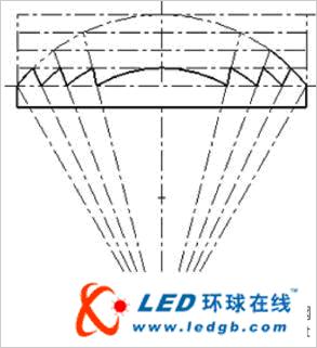 顯然圖1(b)這一菲涅爾透鏡比透鏡(a)要薄,從而吸收小,節省材料。但這種按傳統方法設計的透鏡只對平行光是正確的,這時(c)中陰影部分對光線是沒有影響的。但是若是非平行光,如LED為光源時,(c)中的陰影部分對光線就有影響了。若把它刪除制成菲涅爾透鏡,就會造成很大的雜散光。此外,若透鏡的截面用折線代替小弧線,也會帶來光學上的誤差。