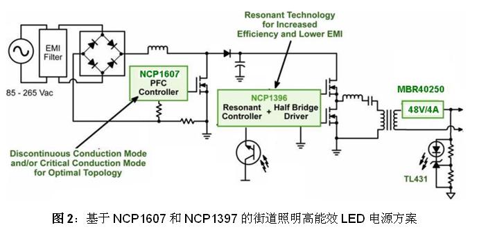 2)基于NCP1607和NCP1397的超高能效大功率LED街燈電源方案
