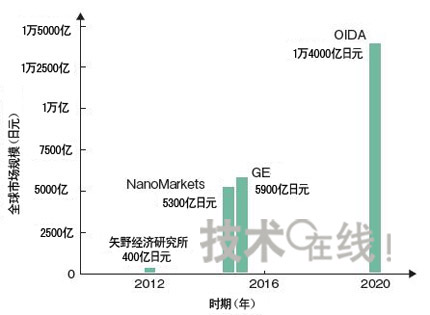 圖有機EL照明/光源市場到2020年將占到照明市場整體的2成圖為針對包括普通照明、特殊照明及背照燈等在內的有機EL照明今后的市場規模,日本矢野經濟研究所、NanoMarkets、GE及OIDA發布的預測及目標。市場規模方面,預計2015年全球將達到5000多億日元,到2020年將大大超過1萬億日元。