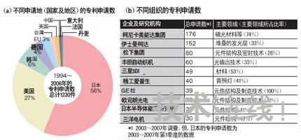 這兩家企業的出資公司也是相同的。著眼于有機材料的應用,不惜賭上公司命運的柯尼卡美能達已率先開始投放廣告。該公司2007年3月與GE在有機EL照明業務上展開合作,“除銷售渠道以外,我們在照片相關業務中積累的有機材料技術及光學系統技術都大有用武之地”(柯尼卡美能達董事長兼尖端材料技術研究所所長駒村大和良)。具體用途為:照片感光材料方面的經驗可用于發光材料等的開發中;鏡頭等光學系統技術可用于光輸出用途;能夠制造出多達15層的多層負片技術可用于卷對卷(Roll-to-roll)制造技術。對柯尼卡美能達而言,“能夠匯集該公司已經撤出的照片業務的人才及經驗的就是有機EL照明業務”(該公司董事兼LA業務推進室長得丸祥)?;A開發日本領先柯尼卡美能達的雄心壯志還表現在專利申請數量上。在有關有機EL照明的專利中,日本的申請數占了全球的近2/3,大大領先于美國等其他國家。其原因之一,就是因為柯尼卡美能達的申請數量很多。尤其是藍光磷光*材料相關專利,柯尼卡美能達的申請數量占到了整體的近3/4)。