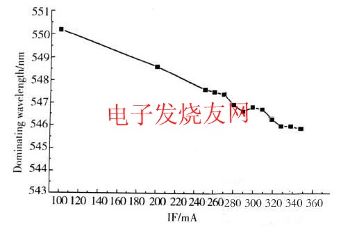 從圖2中可以看出,隨著器件的驅動電流增加,功率型白光LED的色溫從100mA電流時的5636K增加到350mA電流時的5734K。這是因為,電流加大后,芯片發出的藍光增多,熒光粉層的厚度是一定的,則在出射的白光中藍光成份增加,從而使器件的色溫增加。