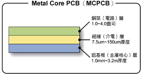 為了改善電路板層面的散熱,因此提出了所謂的金屬核心的印刷電路板(MetalCorePCB;MCPCB),即是將原有的印刷電路板附貼在另外一種熱傳導(dǎo)效果更好的金屬上(如:鋁、銅),以此來強(qiáng)化散熱效果,而這片金屬位在印刷電路板內(nèi),所以才稱為「MetalCore」,MCPCB的熱傳導(dǎo)效率就高于傳統(tǒng)FR4PCB,達(dá)1W/m.K∼2.2W/m.K。