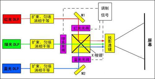 激光顯示系統主要由三基色激光光源、光學引擎和屏幕三部分組成。光學引擎則主要由紅綠藍三色光閥、合束X棱鏡、投影鏡頭和驅動光閥組成,光閥驅動使光閥上分別生成紅、綠、藍三色對應的小畫面,然后分別引入三色激光照明投影到屏幕上,即產生全色顯示圖像。充當光閥及驅動源的可以是各種微型顯示系統、如LCD,LCoS,DMD,GLV等。