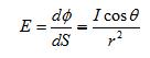 照度(Luminosity)指物體被照亮的程度,采用單位面積所接受的光通量來表示,表示單位為勒[克斯](Lux),即lm/m2。1勒[克斯]等于1流[明](lm)的光通量均勻分布于1m2面積上的光照度。LED陣列的照度是多個單個LED照度的線性疊加。因此只分析單個LED照度。通常LED所照射的目標距離比LED本身大的多,在這種情況下將LED發光管簡化為一個有一定空間光強分布的點光源。點光源的特點是能以4立體角向周圍空間發出相同發光強度的光輻射。假設面元dS接受LED點光源S的光照,設點光源S至面元dS的距離為r,并且點光源發出的元光束的光軸與面元的法線N之間的夾角為,則面元上的照度為: