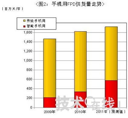圖2表示將HVGA(320×480像素)以上的高分辨率FPD定義為“智能手機用FPD”時,2009年到2011年手機用FPD(液晶與有機 EL)總供貨量中智能手機用FPD的供貨量走勢。從近幾年全球需求不斷擴大的智能手機用FPD市場來看,2011年的增長尤為迅速,預(yù)計2011年智能手機用FPD供貨量約為5億8000萬片,較上年出現(xiàn)大幅增長,增幅達(dá)到72%。