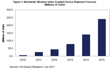 這類支持無線視頻的設備包括智能手機、筆記本電腦和媒體平板,2015年出貨量將從2010年的660萬個增長到2.411億個,復合年度增長率高達105.1%,如圖1所示。