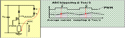 如果能夠保證連續(xù)導(dǎo)通模式運(yùn)行,這個(gè)觸發(fā)操作與隨后的模數(shù)轉(zhuǎn)換過(guò)程將會(huì)計(jì)算出均流值,而不是在電流增大期間通過(guò)軟件處理過(guò)程來(lái)估算均流,如圖2b所示。