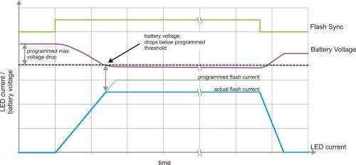 如果閃光燈驅動器本身能夠防止電池電壓下降過多,那么就可以保持較小的安全界限。通過使用一個受控轉換率升高 LED 電流,并在上升期間持續(xù)監(jiān)控電池電壓可以實現(xiàn)這一目標。