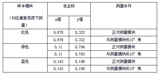 由表1可見,即使人為的偏離基準測量位置達10°角,測得的色坐標數據也沒有明顯變化,因此,除去儀器本身固有的精度等原因帶來的測量誤差,由人對儀器進行操作帶來的測量誤差也基本可以忽略。