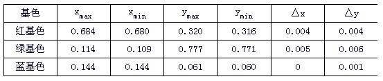 由以上結果,可以看出,LED全彩屏在經過充分老化以后,將進入一個平穩期,三基色的色坐標在小范圍內做不規則變化。其變化幅度有限,可以由表2得出: