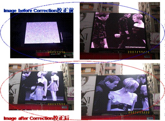 為了徹底改善顯示顯示屏均勻性的問題,需利用專用采集設備在現場對LED顯示屏的每個像素點的光色信息進行快速準確的采集,通過相關算法對每個LED發光管的實際衰減程度進行補償,從而實現真正意義上的一致化校正,即使對于運行不同時間的LED模塊也能實現像素級別的校準。經過校正,使顯示屏恢復至剛出廠時的均勻顯示效果。