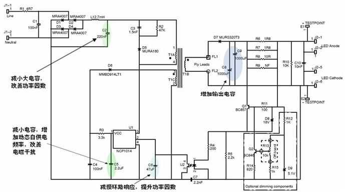 以住宅照明的臺燈和櫥柜燈等應用為例,功率一般在3 W到8 W之間。這樣的低功率應用最適合采用隔離型反激拓撲結構。但傳統離線反激電源轉換器在開關穩壓器前面采用全波整流橋及大電容,這種配置的功率利用率或輸入線路波形的PF較低,僅在0.5至0.6的范圍。這就要引入PFC。如可在反激轉換器前采用NCP1607B這樣的有源PFC,能提供高于0.98的PF,但增加了元件數量及復雜性,且最適合的功率遠高于本應用要求。無源PFC方案眾多,可改善PF,但通常都使用較多額外元件,增加成本及電路板占用空間,并降低可靠性。