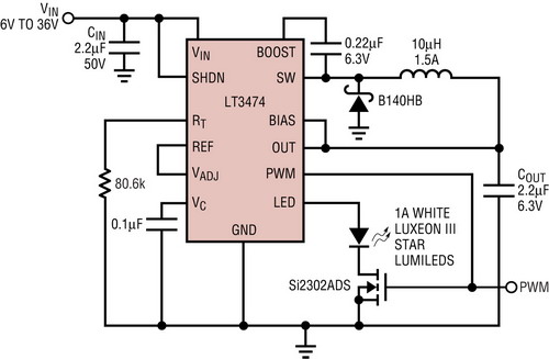 LED亮度可由圖1中的LT3474來控制,把一個模擬電壓輸入連接至VADJ引腳或把一個數字PWM信號輸送至PWM調光MOSFET的柵極和PWM引腳。簡單的模擬亮度控制通過降低內部檢測電阻上的電壓,將恒定LED電流從1A降至更低的值,但是LED光線的顏色在低電流時會變化。調光比的實際限制大約為10:1。