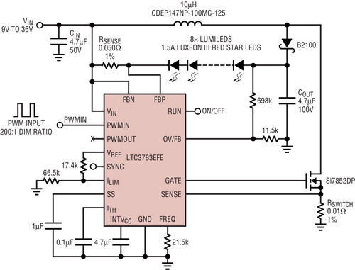 如圖4所示,大功率LED驅動器LTC3783采用降壓-升壓型拓撲,驅動6至10個3W紅光LED,用于汽車尾燈應用。外部開關MOSFET和開關電流檢測電阻為大功率和高壓LED驅動器設計提供了最大的設計靈活性。如果電池電壓降至低于9V,那么9V至36V輸入和在電流為1.5A時高達25V的LED串輸出需要100V的額定開關電壓和高于8A的峰值開關電流能力。在整個汽車電池電壓范圍內,1.5A恒定電池電流是良好穩定的。就剎車燈和尾燈調光而言,在100Hz時,可以用直接連接到LTC3783PWM引腳的PWM信號降低LED電流,以實現高達200:1的調光比。在1kHz時,調光比降低至?20:1,這對尾燈應用來說已足夠了。調節ILIM引腳也可以降低LED電流。
