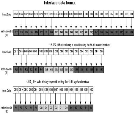圖4 顯示了圖片的數(shù)據(jù)是怎樣實(shí)現(xiàn)灰階的。第一個是典型的24bit 顯示接口,數(shù)據(jù)通過GRAM 后轉(zhuǎn)換成8bit Red、8bit Green 和8bit Blue.同理,18bit 的顯示接口將數(shù)據(jù)轉(zhuǎn)換成RGB 666,16bit 的顯示接口將數(shù)據(jù)轉(zhuǎn)換成RGB 565,繼而混色成0到255 灰階的不同色彩。