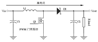 (1)電池使用壽命短:圖2 中,即使關斷升壓轉換器主開關,Vin 與Vout 之間仍會形成一條電流泄露路徑,如果在輸出端接有任何負載,其中泄露電流Ileak 接近于Vin/Rload,那么漏電流的存在使的蓄電池一直處于工作狀態,這樣將會縮短電池的使用壽命。