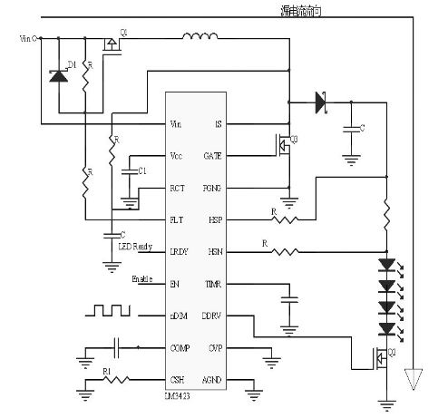 美國國家半導體研發的LM3423 芯片輸入電壓范圍在4.5V 到75V之間,適用于極寬的輸入電壓范圍;50KHZ 的快速PWM調光;內部基準電壓50mV- 1.25V;工作頻率最大可達到1MHZ;內部驅動能力750mA,超低電流停機小于2uA.可以用來配置升壓、浮動降壓、浮動降壓/ 升壓和SEPIC 拓撲結構中低側外部MOSFET的控制器;使用峰值電流模式控制器和預測性關閉時間設計來調節LED 電流,峰值電流模式控制器與預測性關閉時間設計的組合簡化了回路補償設計,同時提供內在的輸入電壓前饋補償;設有用于控制外部調光FET 和系統"零電流"關閉特點的集成驅動器;并且具有LED 狀態輸出標記、故障標記、可編程故障計時器和邏輯針腳,用于控制調光驅動器的極性。