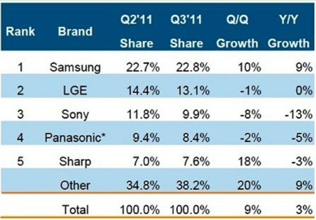 第三季索尼(Sony)為全球平面電視營收第三大品牌,但是市占率大幅下滑,營收年下降13%。松下(Panasonic)和夏普(Sharp)位居第四和第五,夏普在60吋等大尺寸市場營收比重提升。三星則為全球3D電視第一品牌,營收占比為31%;在3D液晶電視中,三星營收也是第一,而松下在3D電漿電視上營收占比最高。