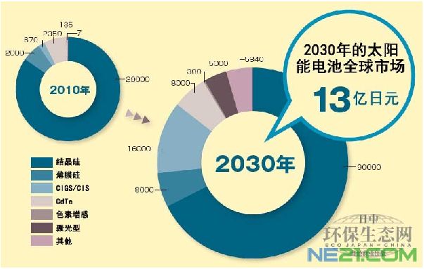 以由銅、銦、鎵、硒構成的化合物為原料,被稱為CIGS或CIS的太陽能電池預計將出現迅速增長。2010年為670億日元,到2030年將擴大到1.6萬億日元,約為2010年的24倍。