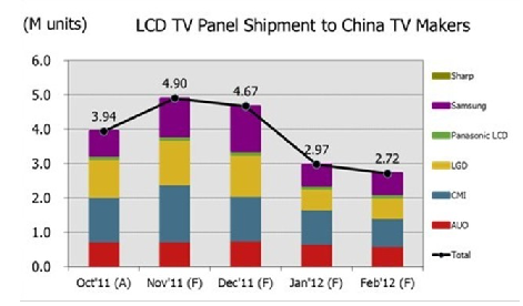 就總體液晶電視面板出貨而言, 預(yù)估向中國大陸本土廠商11月出貨量較上月成長24%, 12月較11月下降5%; 而到2012年1月, 面板出貨數(shù)量將大幅度下滑至不足300萬片, 較12月下降達到36%。