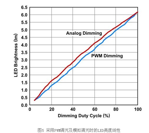 此外,驅動器可達到較高的光電轉換效率,這表示耗用相同的電力可達到更高的流明。然而,模擬調光也有深度調光的某些電流準確度問題,此因回饋調節電壓或電流汲入電壓過小,而無法準確控制,此乃受限于錯誤放大器的偏移電壓所致。亮度線性及色度也不比PWM調光,尤其是在深度調光時(圖5)。事實上,除非將兩個相同的顯示器并置進行比較,否則一般人很難辨別色度或線性的差異。
