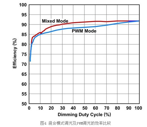 由于升壓轉換器須要提供較低的輸出電壓,因此輸入電源需求會降低并使效率提高(圖4)。在混合模式調光中,驅動器執行D最低達到6.25%的模擬調光,接著轉換為PWM調光,以提高亮度線性。