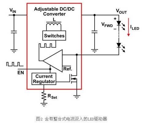 WLED亮度會隨著通過的電流而呈現直線變化,為使得各串行達到最佳的WLED電流準確度及一致性亮度,LED驅動器應調節通過LED的電流電壓,而非調節LED兩端的電流電壓。圖1顯示如何在輸出大于LED正向電壓的總和且電壓(VLED)下降情況下,重新設定任何可調整輸出的電流調節直流對直流(DC-DC)轉換器成為穩定電源,以驅動串聯的多顆WLED。