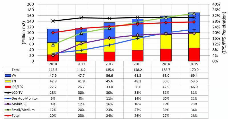 圖1:分模式的TFT液晶面板市場(按面積計(jì)算)和IPS/FFS普及率