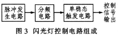 控制電路需要根據(jù)不同的要求進(jìn)行不同的設(shè)計(jì)。對(duì)于閃光功能變化復(fù)雜的控制電路可使用MCU單片機(jī)進(jìn)行控制,這樣控制方便、簡單、穩(wěn)定。由于本系統(tǒng)設(shè)計(jì)只要求閃光燈定時(shí)閃爍,功能單一,故采用簡單的純硬件電路實(shí)現(xiàn)。電路組成如圖3所示。