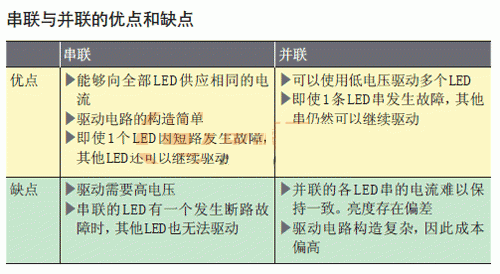 串聯(lián)的優(yōu)點是同串的LED亮度均一。因為向所有LED供應的電流相同。而且,驅(qū)動用IC只需輸出一個電流,就能夠點亮串聯(lián)的全部LED,電路的結(jié)構(gòu)簡單。除此之外,即使一個LED短路發(fā)生短路故障,其他LED仍能繼續(xù)點亮也是其優(yōu)點所在。