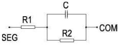液晶顯示屏是由具有透明電極的ITO玻璃和液晶、偏振片等材料組成的。從電路的角度來(lái)講,LCD上ITO走線電阻的大小對(duì)顯示對(duì)比度有很大的影響。LCD的一個(gè)近似等效電路如圖4所示。其中R1表示從LCD電極到LCD像素點(diǎn)的ITO電阻;R2表示LCD像素點(diǎn)的等效直流電阻;C表示該像素點(diǎn)的等效電容。