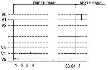 以輸出B形波的芯片的COM線為例。在沒(méi)有加電容之前選擇點(diǎn)和半選點(diǎn)的電壓波形都有畸變,畸變嚴(yán)重時(shí)會(huì)造成串?dāng)_影響顯示對(duì)比度,波形如圖2所示。增加電容后,波形會(huì)得到很大的改善,波形如圖3所示。