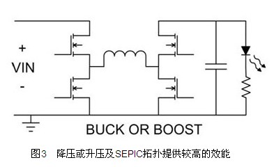 圖2顯示兩種降壓升壓電路,可在輸入電壓可能大于或小于輸出電壓的情形下使用。這些電路與前述兩種降壓拓撲有相同的折沖特點,與電流偵測電阻與門極驅(qū)動的位置有關(guān)。圖2的降壓升壓拓撲,顯示接地參考的閘極驅(qū)動。此拓撲需要位準移位電流偵測訊號,不過反向的升壓降壓拓撲則具有接地參考的電流偵測及位準移位閘極驅(qū)動。如果控制IC與負輸出有關(guān),且電流偵測電阻與LED進行交換,即可利用有效的方式配置反向升壓降壓拓撲。只要適當控制IC,即可直接測量輸出電流,也可以直接驅(qū)動MOSFET。