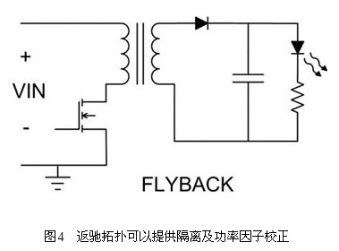 基于安全考慮,可能會規(guī)定在脫機電壓及輸出電壓之間進行隔離。此應用方式下,最節(jié)省成本的解決方法就是使用返馳轉(zhuǎn)換器(圖4),在所有的隔離拓撲中,這種作法所需要的組件數(shù)量最少。變壓器匝數(shù)比可用來對輸出電壓進行降壓、升壓或降壓升壓,設(shè)計彈性很大,不過缺點在于電源變壓器基本上是訂制組件。此外,在FET以及輸入和輸出電容器中,也會有高組件應力的情形出現(xiàn)。應用固定燈光時,可以使用「慢速」的回饋控制循環(huán),調(diào)節(jié)LED電流與輸入電壓同相位的情形,進行功率因子校正(PFC)。這樣可以調(diào)節(jié)所需的平均LED電流,并能調(diào)節(jié)輸入電流與輸入電壓同相位的情形,以提供高功率因子。