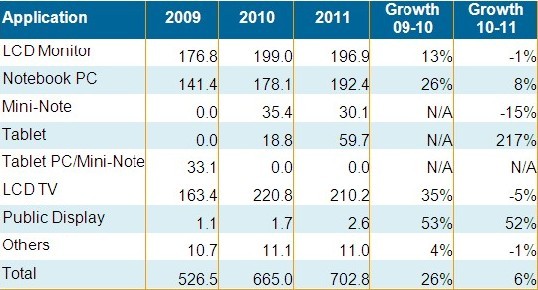 筆記本電腦與公共顯示器依舊維持較佳表現,分別有8%與52%的出貨成長。平板電腦尤其是蘋果iPad的強勁出貨態勢,使平板電腦面板在2011年出貨接近6千萬片,較2010年大幅成長21%。
