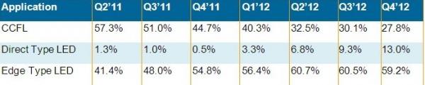 2011年第四季,LED背光在液晶電視面板出貨滲透率為55.3%。根據各面板廠商的計劃,估計2012年第一季液晶電視面板出貨中,LED背光源面板的滲透率將達59.7%,而2012第四季達72%。許多面板廠正積極開發低成本的直下式LED背光源,將成本列為最重要考慮而舍棄厚度,另一方面也保留LED背光優點。NPD DisplaySearch預估Q3’12直下式LED背光滲透率在液晶電視面板中將成長9.3%。