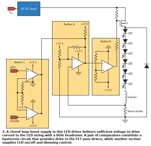 DC-DC升壓變換器是一個閉環升壓電源,它提供了足夠的電壓(至少2V的余量)來驅動流向LED串的電流。圖中A部分顯示了一個比較器及構成正向滯后電路的相關電阻。圖中將感測電阻上的電壓與一個已知參考值作比較。圖中B部分給出了另一個比較器和用于緩沖A部分輸出相關電阻,以確保正確的滯后處理并驅動直通器件。