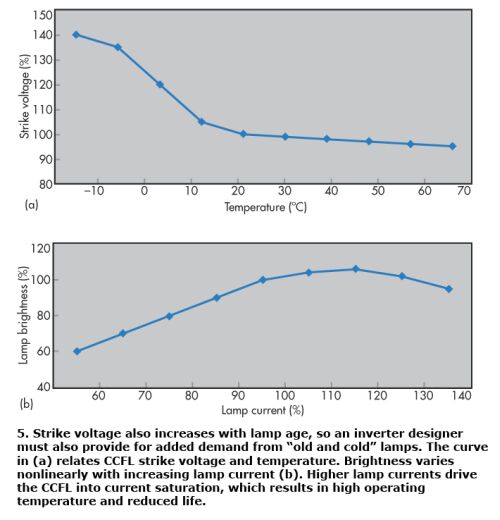 LCD工作時的環境溫度是背光驅動器設計人員需要考慮的一個關鍵因素。CCFL啟動或起始電壓與溫度成反比。圖5a顯示了CCFL起始電壓與溫度之間的典型關系,圖5b則展示了與電燈電流增大相關的CCFL亮度變化曲線。