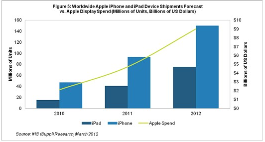 據IHS iSuppli公司的研究報告,由于預計iPhone和iPad產品出貨量今年大幅增長,蘋果2012年可能在這兩款產品的顯示器面板上面支出90億美元,進一步確保其在平板電腦和手機市場中的主導地位。