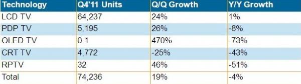 2011年第四季全球電視出貨量較去年同期下降4%,為7千420萬臺。液晶電視出貨量僅上升1%,為2004年以來最低;等離子電視下降了8%,CRT電視下降了43%。日本和西歐市場降幅最大,北美也僅維持少量增長,第四季度三個地區(qū)的電視總出貨量較去年同期下降了21%。新興市場電視出貨持續(xù)成長,增幅為12%,其中液晶電視出貨成長了20%。