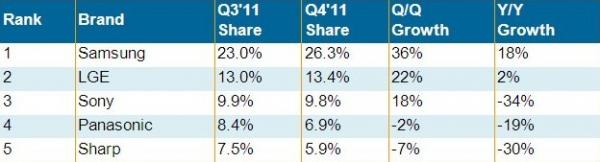 2011年第四季度,三星全球平板電視營收占比提高到26.3%,為所有品牌歷史最高,且較第三季度提高了三個百分比。此外,在液晶電視和等離子電視方面,三星營收占比仍然遙遙領(lǐng)先,且等離子電視占比首次超過松下而居于首位;三星也是3D電視和LED電視市場的領(lǐng)先品牌。樂金電子為全球第二大品牌,占比為13.4%,且是除了三星以外唯一一個前五大品牌中在第四季度取得營收成長的品牌。索尼排名第三,營收占比為10%,但較去年同期下降了30%以上。