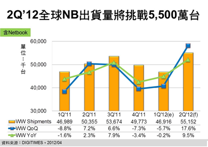 2012年第1季全球NB出貨淡季不淡,所反映的全產(chǎn)業(yè)復(fù)蘇跡象,DIGITIMES Research資深分析師兼主任簡(jiǎn)佩萍預(yù)估,將延續(xù)至第2季,并展現(xiàn)更強(qiáng)勁的反彈,季成長(zhǎng)幅度將達(dá)17.6%,年成長(zhǎng)率也將達(dá)近2年高點(diǎn),為9.5%,單季出貨量則預(yù)估可挑戰(zhàn)5,500萬(wàn)臺(tái)新高。