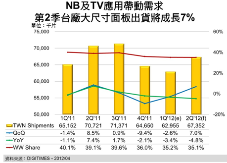 2012年第2季臺廠大尺寸(9寸以上)TFT LCD面板總出貨量將為6,735.2萬片,較前一季增加7%,但較2011年同期則減少4.8%,DIGITIMES Research資深分析師兼副主任黃銘章分析,主要原因為彩晶及華映相繼地淡出大尺寸面板市場,2011年華映的各類NB面板出貨達(dá)到664萬片,但2012年將降至不足100萬片。因此,預(yù)期臺廠佔全球出貨量比重在第2季仍將微幅下跌0.1個百分點至35.1%。