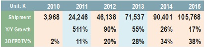 據NPD DisplaySearch調查液晶電視自2010年起開始走向3D影像應用,并且不同品牌間在發展3D技術上存在差異。但不論是快門式或偏光式,消費者對3D電視的接受度還有待考量,市場上仍然不能說已經獲得了成功。2011年3D電視總出貨量約達2千4百萬臺,相較2億臺以上平板電視(包含液晶電視和等離子電視)的總出貨量而言,滲透率僅約11%,但成長率卻高達511%。比起2010年品牌間對3D技術的激烈攻防戰,2011年的3D電視戰爭少了些硝煙味,特別是三星將主力放在智能電視,樂金持續對薄膜式3D電視加碼促銷,并與中國品牌達成聯合戰線,將薄膜式3D技術的市場占有率逐漸提高。