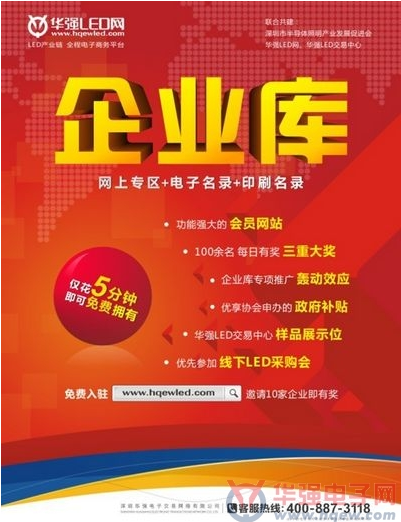 現(xiàn)在進(jìn)駐企業(yè)庫(kù)將享受華強(qiáng)LED網(wǎng)全方位的助力推廣: LED行業(yè)展會(huì)推廣、行業(yè)網(wǎng)站合作推廣、搜索引擎競(jìng)價(jià)排名、強(qiáng)大的數(shù)據(jù)庫(kù)覆蓋推廣(EDM、手機(jī)短信及IM消息)、行業(yè)協(xié)會(huì)和電子城現(xiàn)場(chǎng)推廣、論壇、SEO、百度百科、知道等等。企業(yè)庫(kù)所到之處,你的企業(yè)信息將跟隨企業(yè)庫(kù)一道無(wú)孔不入。