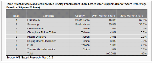 據IHS iSuppli公司的中小顯示器市場追蹤報告,LG顯示器和三星顯示器去年是火爆的平板產品市場的最大顯示器面板供應商,合計占有超過80%的出貨量份額。