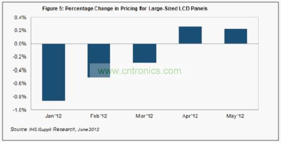 據IHS iSuppli公司的液晶顯示器(LCD)報告,廠商繼續謹慎控制產量和庫存,以抵消電視、監視器和筆記本電腦等主要應用領域的疲弱需求,5月大尺寸LCD面板價格微漲。