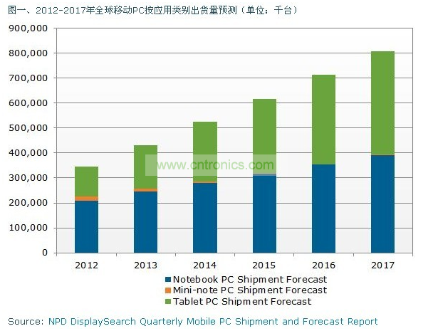 據(jù)DisplaySearch—平板電腦,如蘋果的ipad,預(yù)計將成為未來幾年移動PC市場的主要增長動力。根據(jù)NPD DisplaySearch季度移動PC出貨與預(yù)測報告Quarterly Mobile PC Shipment and Forecast Report,2016年平板電腦出貨量將超過筆記本電腦,移動PC(指包括筆記本電腦、上網(wǎng)本、平板電腦等)總出貨量將從2012年的3億4千700萬臺增長到2017年8億900萬臺。